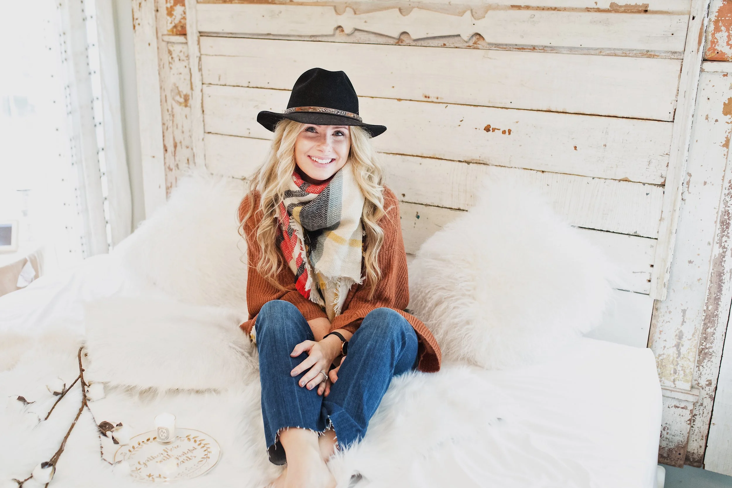 This last look I'm wearing the rust sweater with a plaid favorite scarf, the high wasted flare jeans, and one of my go to hats. I love hats because they totally change a look and they hide my dirty mom hair. I paired this look with a cute pair of my favorite booties to give the look a more rustic hipster, carefree vibe. Shop the sweater HERE. Shop the jeans HERE. Shop the scarf HERE. Shop the hat HERE. Shop the booties HERE.
